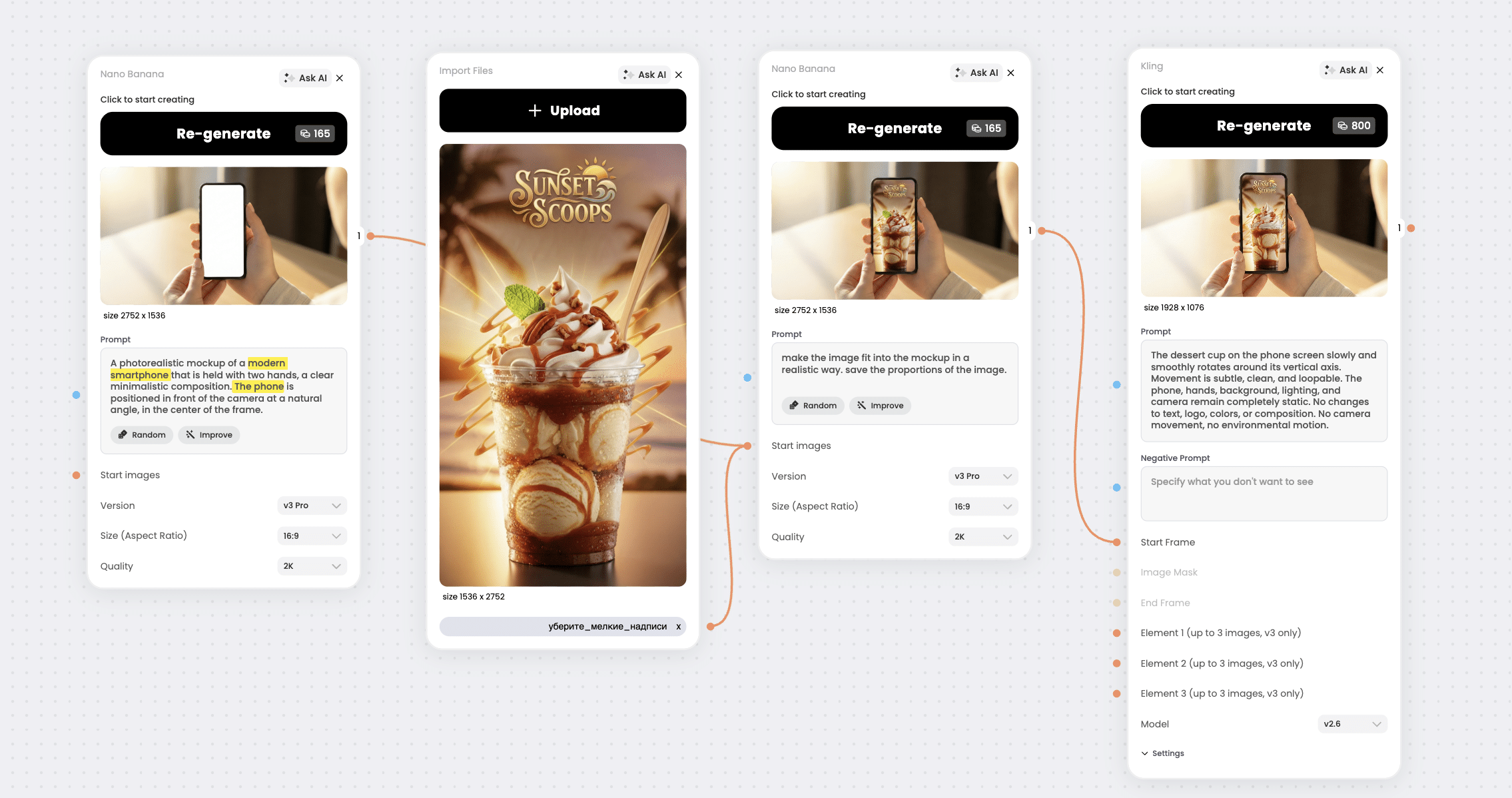 Typical workflow uses GPT Image or Nano Banana for mockup generation and compositing, then Kling for short motion output. The same node logic can be reused across different banner sizes, campaign messages, and seasonal variants while preserving visual consistency.