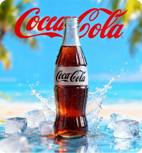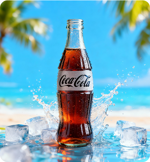 Coca-Cola bottle placed on a bright summer background with ice cubes.