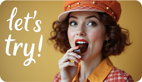 Adv banner with a woman in retro costume and biting chocolate, words 'let's try'