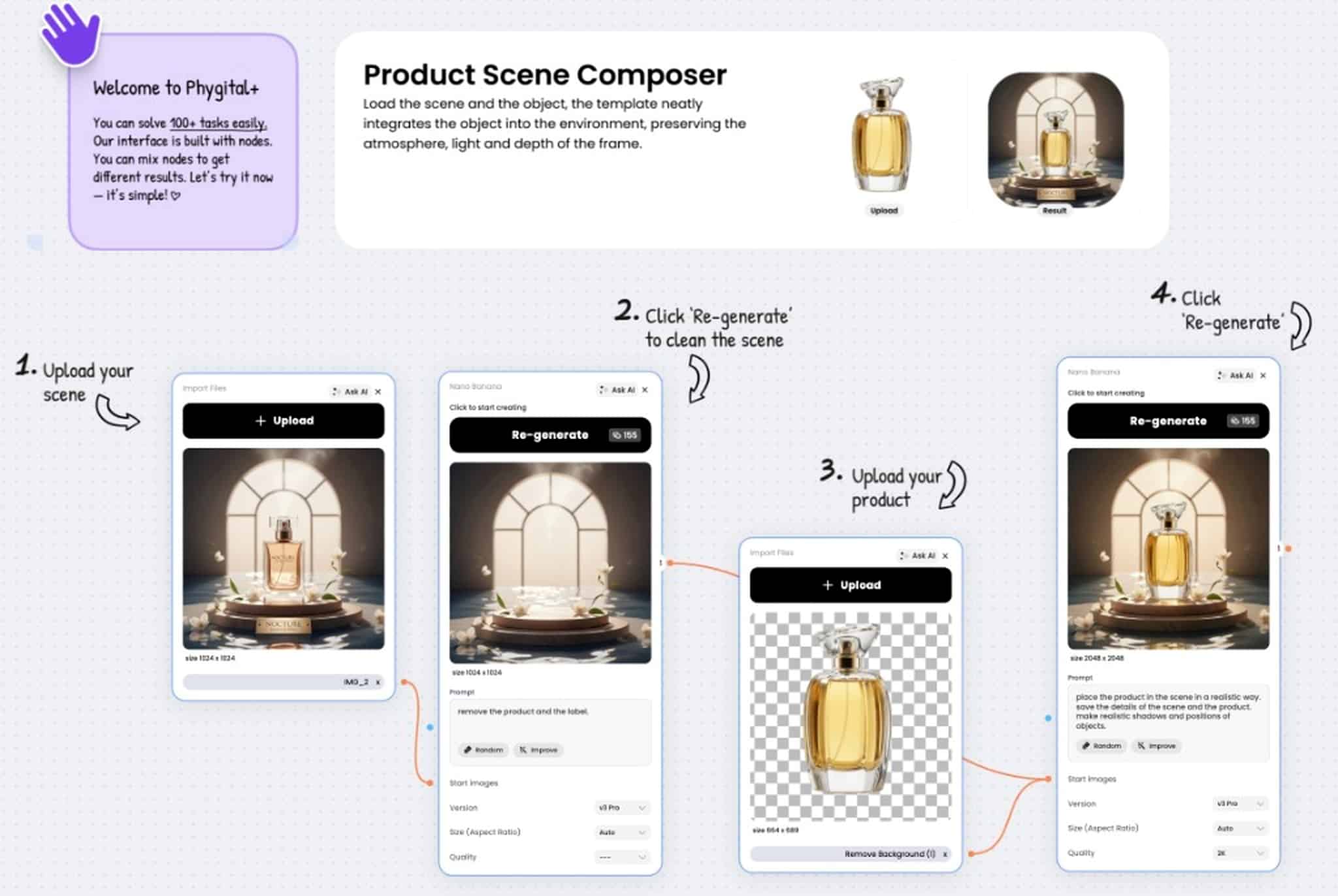 You prepare a scene, clean it with a prompt in the node flow, upload your product, and then generate a final composition with matched shadows and proportions.