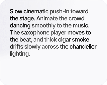 Describe scene structure, visual style, camera movement, duration, motion intensity, and output format. The model interprets composition, lighting direction, transitions, and pacing instructions within a structured generation pipeline.