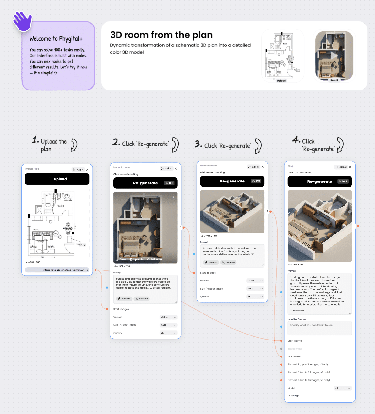 The flow typically uses image generation and video models inside Phygital+ to rebuild the plan into a more detailed 3D room visualization.