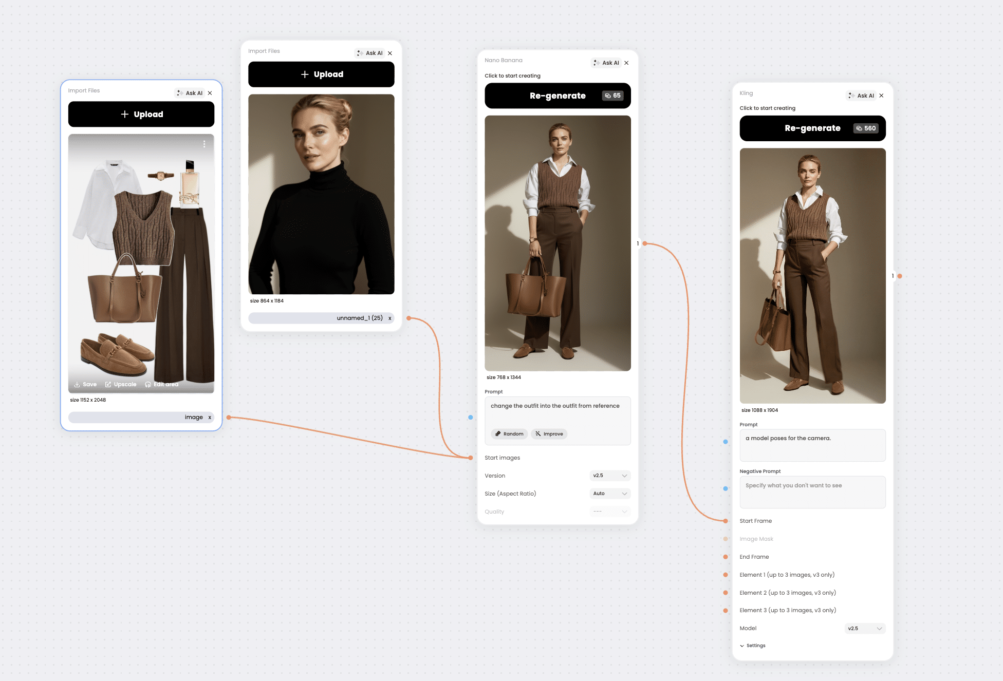 Typical workflow uses GPT Image or Nano Banana for outfit transfer and refinement, then Kling to animate the final look when motion output is needed. The same node logic can be reused across collections, colorways, seasonal drops, and catalog variants while keeping style consistency.
